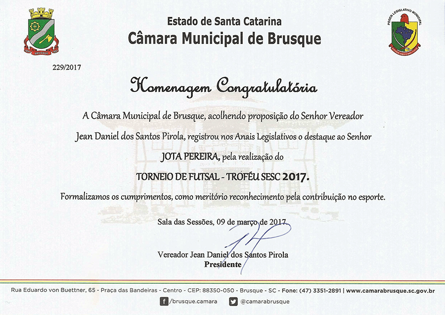O Campeonato Amador agradece o reconhecimento da Câmara Municipal de Brusque, através dos vereadores Jean Pirola e Paulinho Sestrem, pelas notas congratulatórias emitidas em função da realização do 2º Torneio de Futsal Feminino: